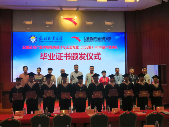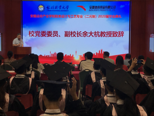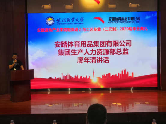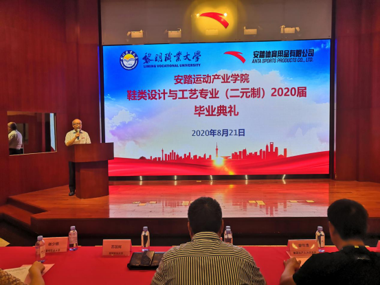 8月21日下午,纺织鞋服工程学院首届“二元制”班级毕业典礼在安踏体育用品集团有限公司隆重举行。校党委委员、副校长余大杭,安踏体育用品集团有限公司集团生产人力资源部总监廖年清及相关部门负责人,纺织鞋服工程学院领导苏国辉、谢少娜、侯霞,教务处校企合作办主任张建鹏,学院教师代表及2020届二元制毕业生参加毕业典礼。毕业典礼由院长苏国辉主持。